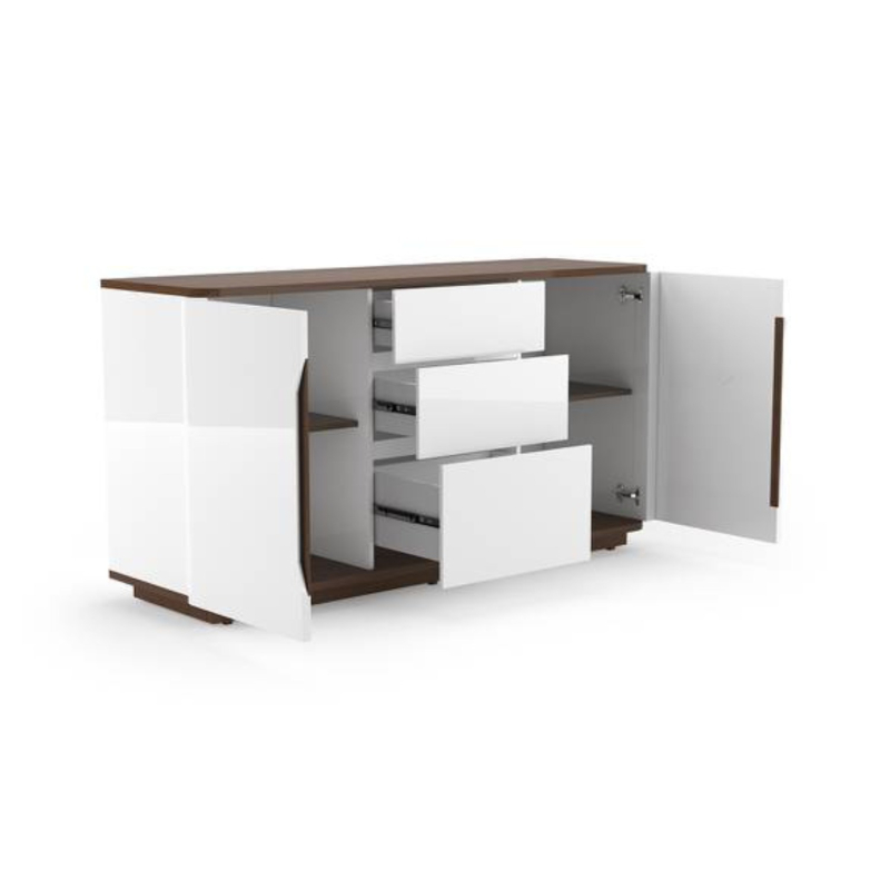 A delight in white. The Baltoro sideboard is all neat, clean lines, and no fuss. The pristine whites and the walnut detailing give it an ethereal look. Three drawers and four shelves make room for your prized china. The walnut-finished table top serves as an elegant serving station. You’re all set - send out that dinner party invite!